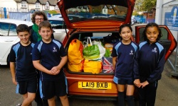 (Photo: Some members of our school council with the car full of donations from our Harvest Appeal, ready to be taken away by Byfleet United Charity.)