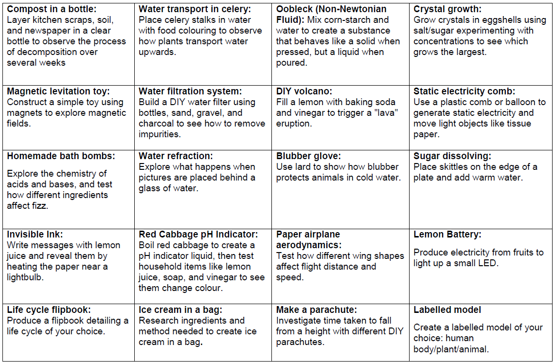 Grid Homework: Please pick one of the tasks on the grid and record this in your homework book (e.g. photos, writing, pictures etc.). By the end of the Summer Term you will need to have completed all the tasks.